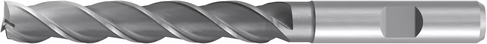 HSS-Schaftfräser mit seitlicher Mitnahmefläche und extralanger Ausführung zum Schlichten in Leicht- und Buntmetallen.
